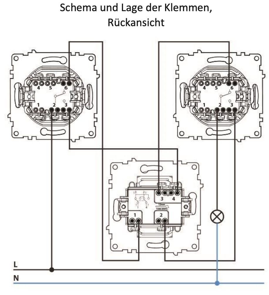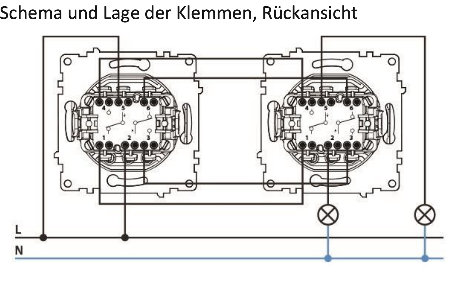 Schematische Darstellung der Steuerung von zwei Leuchten von zwei Orten aus mit zwei Wechselschaltern (es werden zwei Schalter 1E3160130x-E benötigt | |
