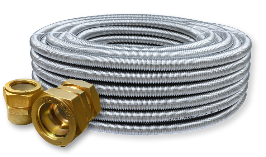 Stahlmann Wellrohre aus Edelstahl AISI 304 und AISI 316L mit Messingfittings ermöglichen eine schnelle und schweißfreie Installation und gewährleisten eine 100%ige Dichtheit.