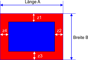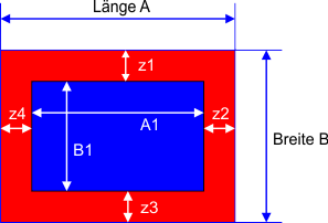 A1 = A - z2 - z4 und B1 = B - z1 - z3 - beheizbare Fläche: F = A1 x B1